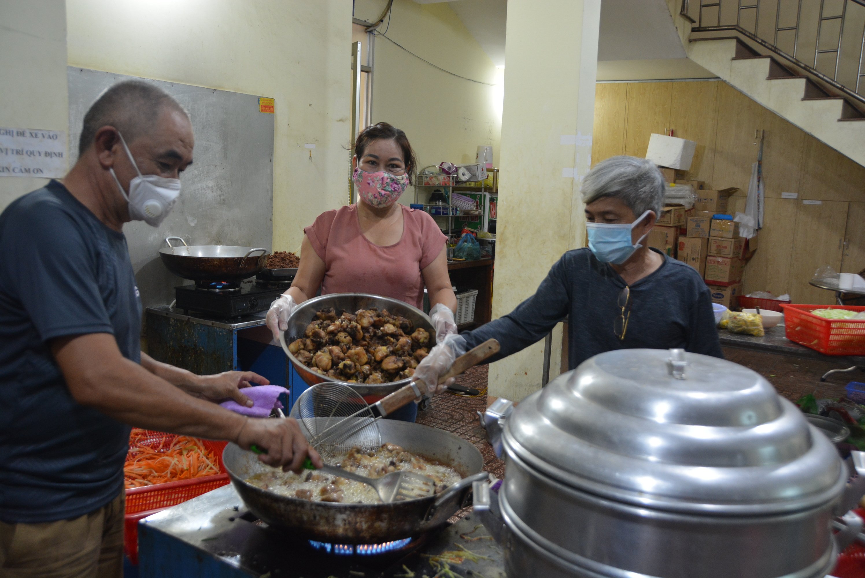 Các tình nguyện viên tất bật chuẩn bị những suất cơm để kịp thời mang đến cho bà con trở về từ các tỉnh phía Nam vào trưa 4-10